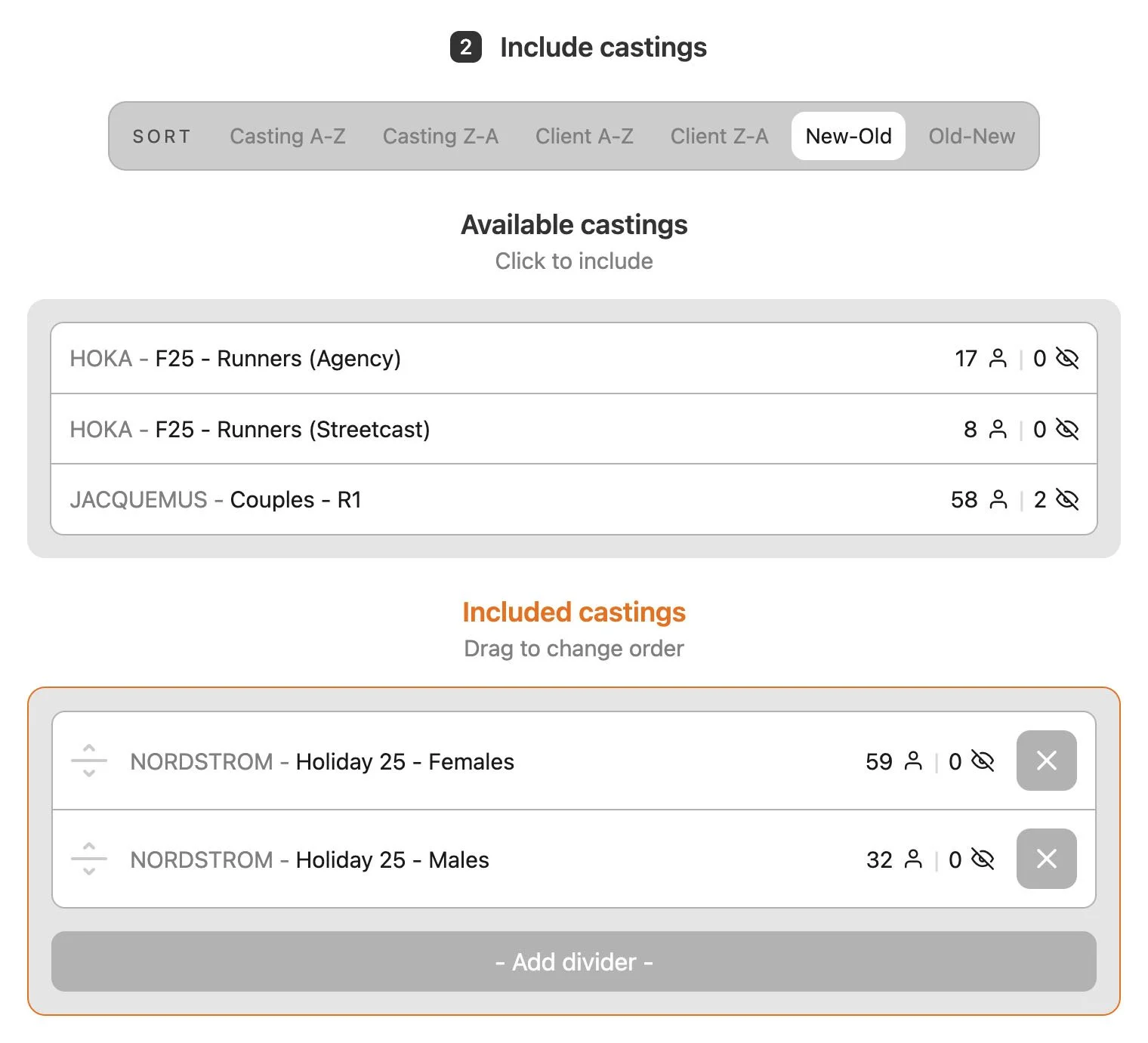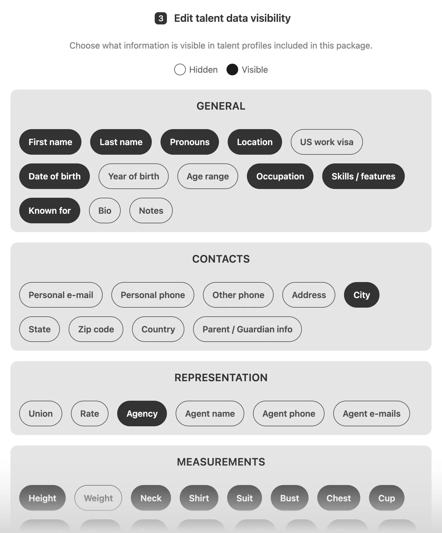 Add any number of castings to a package and choose which information inside talent profiles is visible to your client.