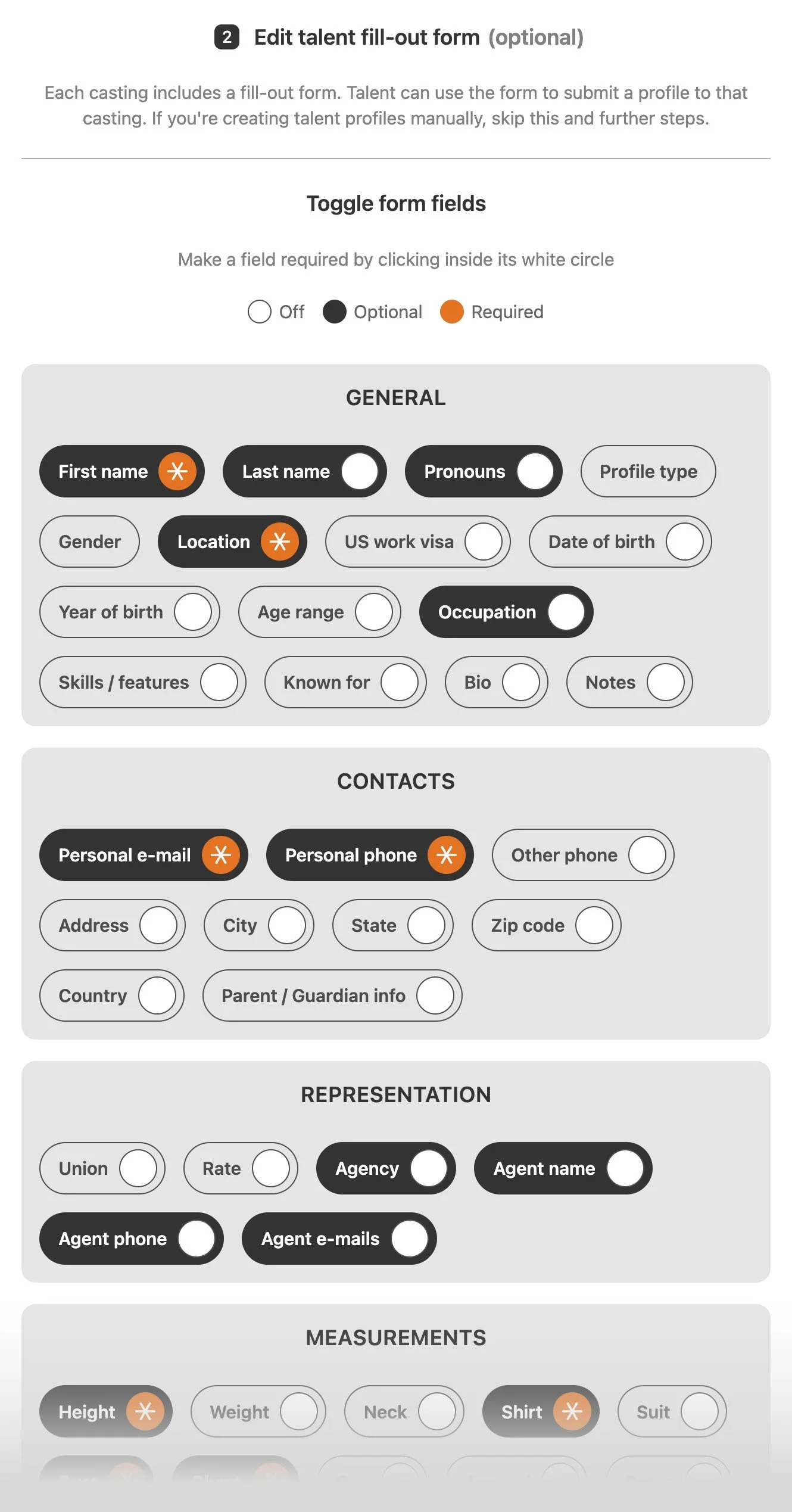 Castings store talent profiles and can be populated manually or through highly-customizable fill-out forms.